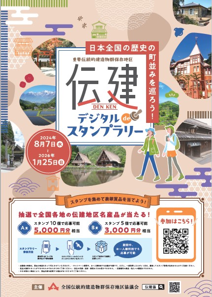 | 賞品 | A賞:スタンプ10個で応募可能 全国各地の伝建地区所在市町村の名産品 5,000円分相当 B賞:スタンプ5個で応募可能 全国各地の伝建地区所在市町村の名産品 3,000円分相当 |